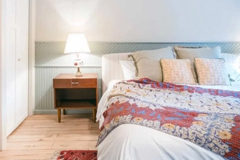 A cozy private bedroom with a full-sized bed and a slightly smaller footprint. Bathrooms are shared.